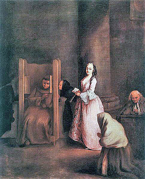 SOMMAIRE 1. La confession 2. Chronologie historique 3. Le secret de la confession et la Loi 4. Le sacrement de pénitence ou de la réconciliation 5. Le point de vue théologique 6. Le péché 7. Les vertus chrétiennes 8. Citations 1. La confession La confession, dans les théologies juive et chrétienne, est l’aveu de ses péchés à Dieu pour en obtenir l'absolution. La Bible insiste à plusieurs reprises sur la nécessité de la confession, notamment dans les exhortations des prophètes. Dans la tradition chrétienne, la confession [du latin confessio (= aveu) de confiteri, confessum (= avouer)] revêt deux formes : la confession privée à un prêtre, appelée confession auriculaire (qui peut être particulière, lorsqu'on n'accuse que les péchés commis depuis une confession précédente ou générale, lorsqu'on accusé les péchés qu'on a commis pendant toute sa vie) et la confession publique d'un individu devant l'assemblée des fidèles. Dans l'enseignement catholique, la confession auriculaire est considérée comme une partie essentielle du sacrement de pénitence 1. Les catholiques sont tenus de confesser leurs péchés les plus graves à un prêtre, au moins une fois par an, à Pâques. ![]() La confession, Pietro Longhi (1702–1785), Galerie des Offices, Florence Ce pouvoir de lier et de délier, c'est-à-dire de pardonner les péchés, est conféré aux apôtres (Matthieu 16,19 ; 18,18) ; la confession et l'absolution s'appuient aussi sur l'évangile selon Jean (20, 22-23). La confession auriculaire paraît avoir été pratiquée par un grand nombre de religions différentes et remonter à une haute antiquité. L'abbé Guillois (+ 1856) écrit : « On se confessait dans les mystères de Bacchus, de Vénus et d'Adonis. Les prêtres qui entendaient les confessions portaient une clef pendue aux épaules : c'était le symbole du secret qu'ils devaient garder. A Samothrace, des sacrifices expiatoires, une confession en règle, précédaient l'admission de l'initié aux mystères cabiriques. Le prêtre qui y présidait se nommait koeês (purificateur, prophète) ; il avait le pouvoir d'absoudre du meurtre, mais le parjure était considéré comme un crime capital. A Eleusis, ce n'était qu'après avoir subi de longues et difficiles épreuves qu'on pouvait être initié aux mystères de Cérès. Un prêtre était chargé d'examiner et de préparer les candidats ; ceux qui s'étaient rendus coupables de grands crimes étaient exclus ; le prêtre soumettait les autres à des expiations fréquentes, et leur faisait sentir la nécessité de préférer la lumière de la vérité aux ténèbres de l'erreur ; il les exhortait à réprimer toute passion violente, à mériter par la pureté de l'esprit et du cœur l'ineffable bienfait de l'initiation. » Les empereurs eux-mêmes ne sont pas exempts de ces épreuves et de cette confession. L'histoire nous rapporte que Marc-Aurèle, en s'associant aux mystères d’Eleusis, est obligé de se confesser à l'hiérophante. « L'hiérophante, en congédiant l'assemblée, prononçait deux mots égyptiens qui signifiaient : Veillez et soyez purs ! » (Voltaire) Chez les Chinois, lorsque l'empereur, à la tête de la nation, remplit l’office de sacrificateur, il pratique un grand nombre de cérémonies parmi lesquelles se trouve la confession : il s'avance vers l'autel, brûle des parfums et prend ensuite le yu-pé, pièce de satin sur laquelle il a écrit le détail de ses actions, bonnes ou mauvaises ; il lit cet écrit à voix basse, fait des actes de repentir sur ce qu'il reconnaît avoir été mal, dépose le yu-pé dans une cassette et y met le feu pour le réduire en cendres. Au Tibet, non seulement tous les religieux, mais presque tous les laïques, ont leur père spirituel, à qui ils font en général l'accusation de leurs péchés. Aussitôt que le pénitent prononce cette formule : « J'ai péché », le directeur fait sur lui une prière pour lui obtenir le pardon qu'il demande. Quatre fois par mois, le 14 et le 15, et ensuite le 29 et le 30 de la lune, les lamas s'assemblent pour entendre l'explication de leur règle. Avant de paraître dans l'assemblée, le grand lama se confesse à celui à qui il a confié la direction de sa conscience ; ainsi purifié, il entre dans le temple et commence à recommander à chacun de se confesser. En Perse, parmi les ministres de la religion zoroastrienne appelés mages, il y a ceux qui entendent les confessions, décident les cas de conscience, et éclaircissent les points de la loi. Les livres des mages ordonnent de pardonner à celui qui a offensé, s'il s'humilie et confesse sa faute. Outre les neaesch qui sont des prières humbles et soumises, et les afergans qui sont des prières en forme de remerciements, les livres contiennent des patets qui sont des actes de repentir des péchés que l'on a commis et qui constituent une véritable confession générale. C'est une maxime parmi les Indiens que celui qui confesse son péché en recevra le pardon. Ils célèbrent tous les ans une fête, pendant laquelle ils vont se confesser sur le bord d'une rivière, afin que leurs péchés soient entièrement effacés. Le Nittialarma ou rituel des brahmanes, attribue la vertu d'effacer les péchés à certaines prières qui ressemblent assez aux actes de contrition des chrétiens. Confession et pénitence font aussi partie des observances des moines jaïns. La confession est également connue des anciens habitants du Japon. Celui qui veut expier ses péchés se rend dans un désert où il est reçu par des ermites qui le soumettent à un régime sévère de jeûnes et de mortifications. Celui qui a subi toutes les épreuves arrive enfin au haut d'une montagne où on le met dans une balance suspendue au-dessus d'un abîme. A chaque aveu que fait le pénitent, la balance s'abaisse vers le gouffre. S'il a l'air de ne pas faire un aveu complet, on le précipite au fond. Si, au contraire, sa confession es